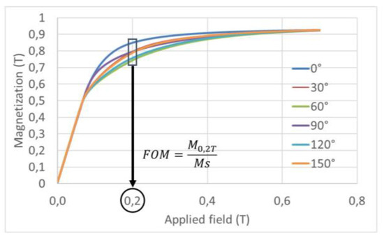 Example of in-plane hysteresis loops (upper branch only) at different azimuthal applied field angles for monocrystalline Terfenol-D disk.