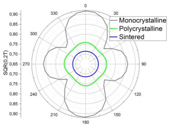 Typical polar plots with SQR0.2T are shown in Figure 3 for monocrystalline, polycrystalline and sintered samples. For disks cut from single crystals, one can identify expected easy axes at 0° and 90° and hard axis at 39° and 129°. This is consistent with the [112] orientation of the samples. For disks cut from cast materials, variation of SQR0.2T over the angle is weaker indicating lowered anisotropy which is consistent with the observation of partially disoriented grains. Finally, results for hot-pressed powder materials are circular (isotropic) which is expected for randomly distributed grains. Lower radii for polycristalline and sintered samples indicate higher driving fields to reach the saturation due to internal demagnetizing fields (grain boundaries and porosity).