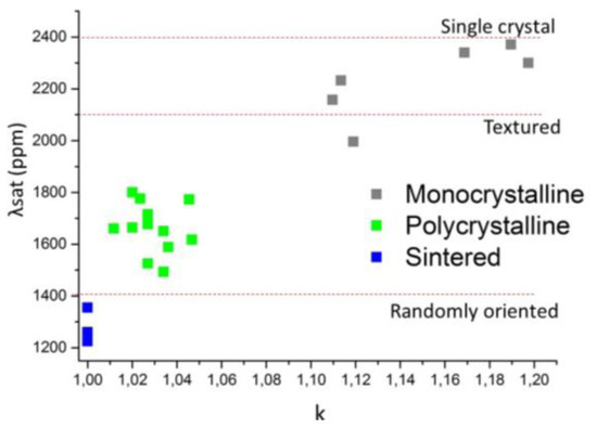 Dependence of the saturation magnetostriction λsat with the magnetic anisotropy ratio k for monocrystalline, polycrystalline and sintered samples.
