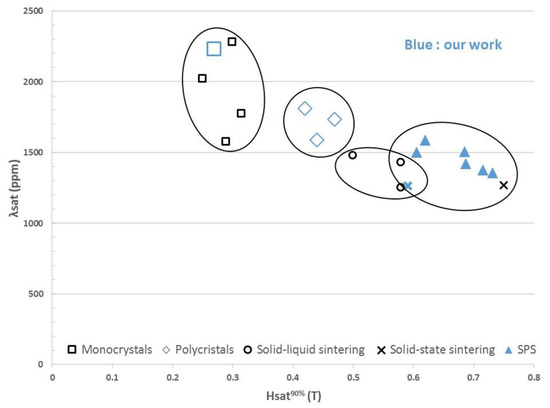 Figure 6 illustrates the obtained “performance phase diagram per technique”. For applications, attention is focused on the couple λsat, Hsat90% (practical drive field to reach 90% of λsat). Our results (in blue) complement those of the literature (in black) [5,6,7]. As expected, Terfenol-D single crystals remain the most efficient material located at the top left of the diagram. However, the best performance with miniature disks is obtained with a selection of sorted samples. The diagram reveals the very broad dispersion with unsorted single crystal disks approaching the intermediate performance materials. This central area (new) is occupied by disks of cast polycristalline materials which have been little used before. The area for sintered materials is shifted on the bottom right of the diagram. Hot-pressed powder materials are further penalized by higher driving fields due to residual porosity and oxidation. In this work, we show that SPS technique may bring them back close to the middle with reducing these defects. More, sintered materials (not oriented) are isotropic.