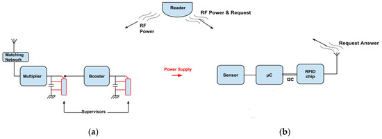 Block diagram of the autonomous connected sensor: (a) Block diagram of the RF energy harvesting and conditioning circuit enhanced with supervisors coupled with charge capacitors; (b) Block diagram of the connected measurement system and UHF RFID reader on the top of the figure.