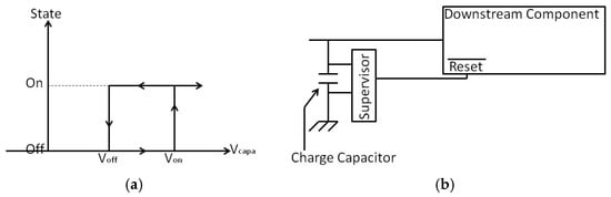 In our energy harvesting system, the supervisors play a key role regarding the efficiency optimisation: it control the use of the harvested energy. Indeed, the main difficulty is to get enough power to overpass the needed energy to activate the following stage. The supervisor turns off the downstream circuit and leaves time to the charge capacitor to reach the necessary voltage Von to activate the downstream component. Thanks to this, we prevent the system from ending up in an intermediary state, where the downstream component would drain energy from the capacitor—the latter’s voltage Vcapa thus remaining too low for the former to start. When the capacitor voltage drops below a minimum value Voff < Von, the supervisor turns off the downstream components. This hysteresis principle is shown in Figure 2a while Figure 2b presents the charge capacitor and supervisor coupled system.