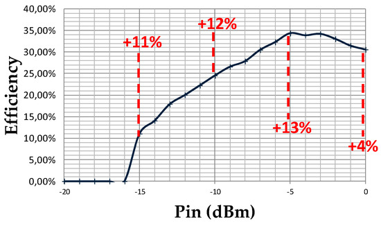 The overall system efficiency is presented in the Figure 6. With −10 dBm, we are able to obtain an efficiency of 25% which is an improvement of 10% compared to the same circuit without supervisors. Comparing with [5], where a similar configuration is used, but with only one supervisor, the efficiency for −10 dBm is about 21% since our system has a higher efficiency. Thanks to this enhanced system, we are able to obtain the 2.1 V required to activate the microcontroller and more generally to supply the measurement circuit with less input power as shown in Figure 5. The minimum input power to activate the measurement circuit is reduced from −11 dBm to −15 dBm and the efficiency gain of our system is clearly improved in comparison with the same measure without supervisor.