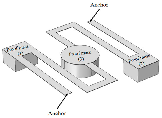 The schematic of the proposed multimode MEMS piezoelectric harvester is illustrated in Figure 1. This energy harvester is anchored on two sides. In the other words, it can be overviewed as a doubly clamped cantilever. Since this proposed energy harvester has a symmetric structure, multi-degree of freedom provides nonlinearity behavior during the oscillation of the device. In order to enlarge the device efficiency and reduce its operating frequencies, we have utilized 3 proof masses at different locations, which are numbered sequentially. Consequently, these suspended proof masses, which are bonded to the cantilever, increase load force as well as device mass for frequency reduction.