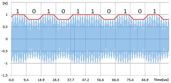 Oscillogram of PID to PICC communication via ~10% amplitude modulation. Logic Zero is represented by low amplitude, logic one is by high amplitude of the carrier (13.56 MHz).