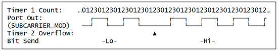 Timer counting scheme: SUBCARRIER_MODULATION is toggled by timer 1. On timer 2 overflow, the toggling scheme is inverted or not, depending on the data to be transmitted. This generates the BPSK signal.