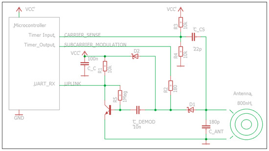 In Figure 5, a schematic of the integrated RFID transponder is shown. The diode (D1) demodulates, on the one hand, the AM uplink signal (Figure 2), and on the other hand, in combination with D2, rectifies the carrier to generate the supply voltage (VCC). The generation of the supply voltage may be omitted if the device is self-powered. The NPN transistor acts as a sensitive amplifier for the AM uplink signal, which is forwarded to the microcontroller serial input (UART_RX).