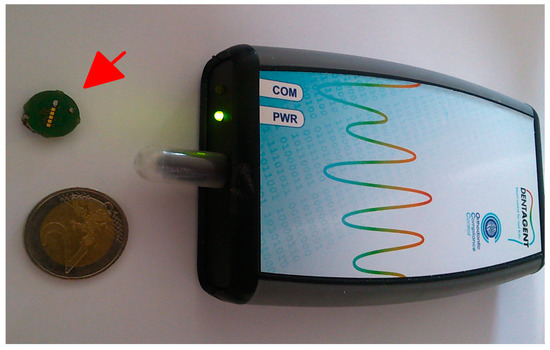 The concept was successfully implemented and tested on several low power microcontrollers (MSP430F149, MSP430F2370, MSP430FR5739, Texas Instruments, TX, USA). Because of the slow system clock (8 MHz RC-Oscillator), which is common at low power systems, it was necessary to use assembler coding and optimization techniques like loop unrolling. The integrated RFID transponder works properly with a commercial wireless readable miniature temperature logger [2,3], Figure 6. In this setup, reading distances of about 2 cm are achieved, which is sufficient for this specific application. This limitation is mainly caused by the relatively small antenna size. Due to the relatively low hardware requirements, (2 timer units), it should be possible to transfer the setup to other microcontrollers easily.