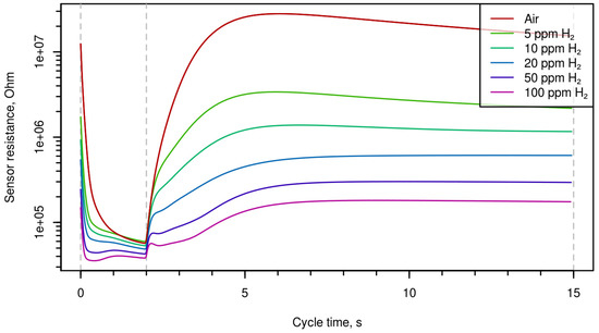 Time-resistance dependences during one period are shown in Figure 1 (for different hydrogen concentrations), Figure 2 (different concentrations of CO), Figure 3 (different concentrations of H2S). One can mention that the shape of the curves can characterize both the nature of the gas and its concentration.