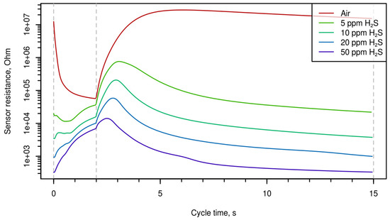 Process analysis was organized using cycles with 15 s period. At the beginning of each period the sensor was heated up to 450 °C during 2 s and cooled to 100 °C during 13 s.