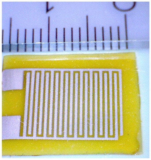 A silicone (smoothinoc) mold with a cavity of W × L × T = 1.5 × 1.5 × 0.045 mm3 is filed with the resin mixture. The mixture of RTM6 and plasticizer is cured in an convection oven at 155 °C for 8 h. After curing of the mixture, an interdigital structure is screen-printed on the substrate using a manual screen-printing machine with plastic screen hollow mask (SEFAR, PCF-FC180-27-Y-PW). The electrically conducting silver paste KA801 (Du Pont) is chosen for interdigitated combs. After screen-printing, the silver paste is cured at 135 °C, for 15 min. A photograph of this sensor is given in Figure 1. The electrodes have width and spacing of 500 µm.