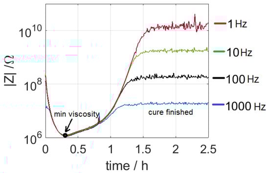 The measured impedance is correlated to the resin viscosity and correspondingly curing degree of resin []. For all thermoset resins, the viscosity drops by increase of temperature, until the resin reaches the point of minimum viscosity. Then, polymerization starts, which results in an increase of cross-linking in the polymeric 3D network and consequently increase of resin viscosity. The increase of viscosity consequences in the rise of the measured impedance from sensor’s contact pads.
