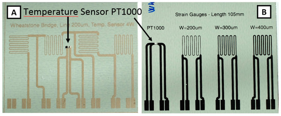 Figure 2. Resistors in a Wheatstone bridge configuration which are oriented perpendicularly to the applied strain are insensitive to the mechanical load applied to the free end of the single clamped steel beam and facilitate a basic temperature compensation of the bridge output voltage. Changes in the bridge voltage according to the applied tensile and compressive strain were measured at different operating temperatures. Conductive carbon black (PR-406B) and silver (PF-050) pastes were printed to create meander–like resistors with a linewidth of 100 μm, 200 μm, 300 μm, and 400 μm respectively.