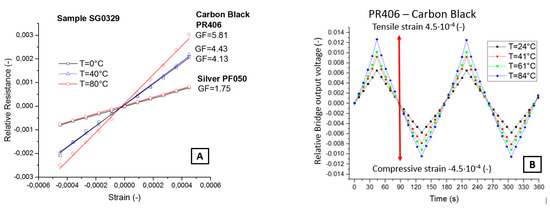 In both cases, the electrical conductivity originates from conductive paths within the polymer matrix, and the piezoresistive behavior is influenced by both intra- and inter-particle effects. The resulting strain sensitivity depends on factors like particle conductivity, percolation level and process parameters (e.g., curing temperature). Silver strain gauges exhibits excellent linearity, repeatability and constant temperature coefficient of resistance over wide range of temperatures. Carbon black exhibits a higher deformation sensitivity (GF is 2 ÷ 3× higher, compared to silver), but its temperature dependence of deformation sensitivity is also higher and disadvantageous in the practical utilization and design of conditioning circuits.