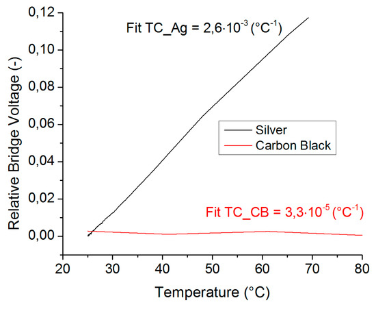 −4 (-)) were performed for each temperature step. The resistance of individual resistors or bridge output voltage was measured using a precision multimeter (Keithley DMM7510). The strain sensitivity (GF) of the silver piezoresistors remains constant at the level of GF = 1.75 (-) over the measured temperature range, while the sensitivity of the carbon-black piezoresistors increased by 40% up to the level of GF = 5.81 (-). A similar behavior can be observed for bridge based samples. The low absolute resistance (50 ÷ 150 Ω) of the silver resistors shows that the paste is fully cured. The silver particles create a good conductive path which is stable even at elevated temperatures. However, the GF of the silver paste provides a lower strain sensitivity, which is mainly caused by a change in dimensions due to applied strain. In the case of carbon black, lower particle conductivity and lower percolation levels lead to higher absolute resistances (6 ÷ 15 kΩ) and stronger intra- and inter-particle effects under applied strain and thus higher GF, which shows a stronger temperature dependence.