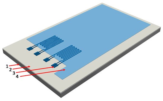 Figure 1 shows a schematic of a sample, where the substrate is sheet steel with an organic coating pre-applied for electric isolation (1, 2). On top of that, the sensor is realized (3). Optionally the sensor is then top-coated with another organic polymer layer utilizing spin-coating technology. This fabrication procedure was described in detail earlier ([