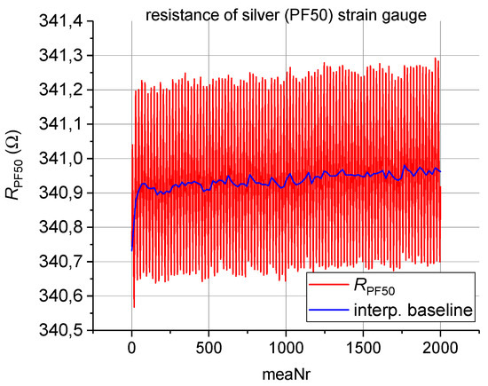 Figure 2 depicts one hundred measurement cycles of the silver-based strain gauge. One measurement cycle is defined as a movement of +5 mm to impinge compressive strain onto the strain gauge, followed by a movement of −10 mm to reach a −5 mm position and thus impinge tensile strain resulting in 20 measurement points per cycle. It is clearly observable that after the first 10 cycles the silver-based strain gauge is more or less stabilized. On the contrary, as can be seen in