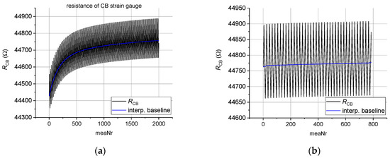 Figure 3b depicts the second run for carbon black; it shows that the sensor response has stabilized significantly and no set-in effect can be observed. Further, the influence of sensor fabrication on the nonlinearity of the gauge factor was investigated. It was demonstrated that the nonlinearity could be significantly reduced by introducing a stabilizing top coat. This behavior is shown in