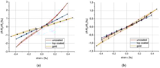 Figure 4a,b both depict an additional gauge factor measurement of pure gold. Since pure metallic strain gauges should respond linear and without hysteresis, the assumption that the hysteresis originates from the polymer coating can be made.