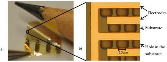 Processing the sensor starts with spin coating Polyimide (U-Varnish S, UBE) on a silicon wafer. The thickness after curing is about 5 µm. Polyimide is chosen as a substrate because it can be fabricated in the desired thickness, it is highly flexible and it withstands the high temperatures (up to 200 °C) during the fabrication process. Afterward, 300 nm gold is sputtered and wet chemical structured. The last fabrication step is dry etching of the polyimide substrate to separate the sensors. Between the fingers, holes are etched in the polyimide to allow the resin flow through the sensor. The holes have a size of about 10 µm × 10 µm (see Figure 1b).