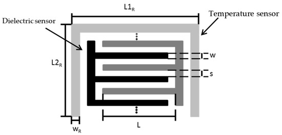 Schematic of the sensor (top view). The interdigital structure in the middle consists of N = 150 electrodes with width w = 10 µm and spacing s = 10 µm. The length is L = 6 mm. The resistive structure has a total length of and a width of 40 µm.