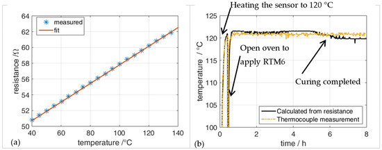 (a) Measured temperature characteristics of the resistive structure; (b) Temperature in the resin measured with the resistive structure and externally measured temperature during the curing of the RTM6 resin.