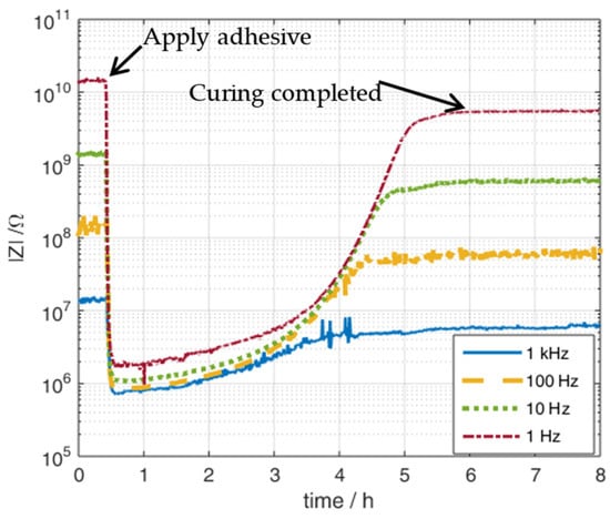 In Figure 4 the absolute value of the impedance during curing is shown over time for selected frequencies. The curing process can be directly correlated to the impedance value. During curing the viscosity of the material increase. The movement of the free charges inside the material decreases and therefore the resistance of the material increases. This can be correlated to the increase of the absolute value of the impedance [3]. After five hours the absolute value of the impedance stays constant. This indicates that the curing process of the RMT6 is completed.