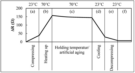 Change of resistance in a long-time measurement of a strain gauge embedded in a compressed O-ring: (a) Resistance during compression; (b) Raise of temperature to 70 °C; (c) Resistance change at 70 °C within 72 h; (d) Cooling; (e) Releasing compression; (f) Remaining zero-shift [4].