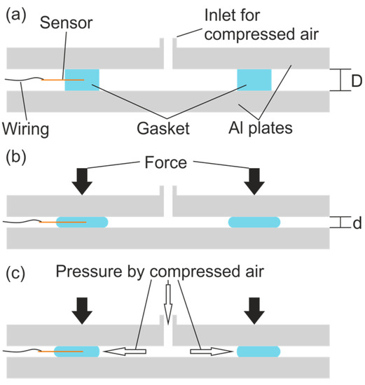 FEM simulation indicates, that not only the temperature has an influence on the strain gauges signal and, therefore, on the capability to monitor a gaskets condition, but also lateral pressure on the gasket from inside of the sealed volume might cause an unneglectable change in the measurement signal. The measurement setup to determine the influence of this pressure is depicted in Figure 4. The gasket is placed between to aluminum plates; one of which has an inlet for compressed air (a). The gasket is then compressed by applying a force on the top plate (b). In step (c), compressed air creates pressure inside the sealed space between the plates.
