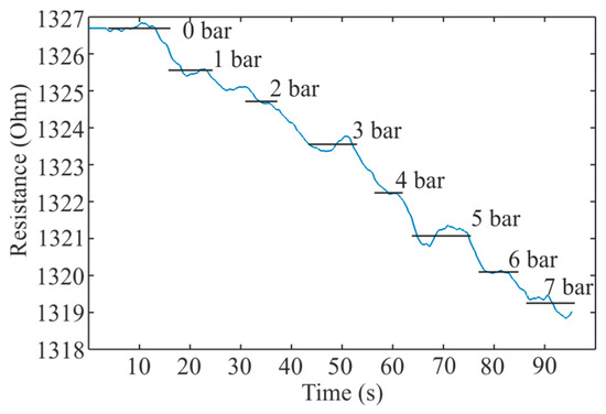 The pressure is varied from 0 to 7 bar. The initial compression of the gasket increases the resistance from 1269 Ω to 1327 Ω, which indicates a large elongation of the strain gauge. Figure 5 shows the change of the strain gauges resistance over time with different applied pressures. When a pressure of 7 bar is applied to the sealed volume, the resistance decreases by approx. 8 Ω. The average rate of the change of resistance is around 1 Ω/bar. As the change in resistance caused by the applied pressure is in the same range as the change caused by aging, the systems reliability for condition monitoring is limited.