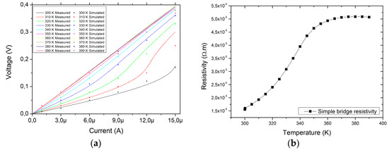 The electrical characteristic of the simple bridge was measured in the 300–390 K range (Figure 1a). R(T) curve was fitted using a polynomial of degree 9 and was implemented into the COMSOL simulation software. Electro-thermal analysis has been performed assuming only heat transfer conduction mechanisms.