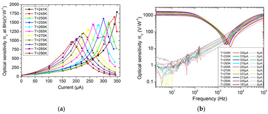 Optical characterization (a) Optical sensitivity as a function of the bias current for temperatures in the 240–290 K range; (b) Frequency response of the LSMO suspended bolometer measured at the optimal current for temperatures in the 245–290 K range.