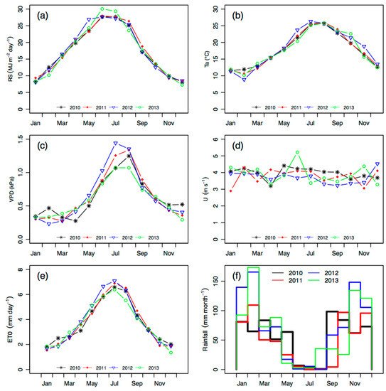 Climatic conditions during the four years of the experiment, recorded at the meteorological station: (a) Incoming solar radiation; (b) air temperature; (c) water vapour deficit; (d) wind speed; (e) reference evapotranspiration; (f) rainfall amounts. Values in (a–e) are the monthly averages, values in (f) are cumulated rainfall amounts.