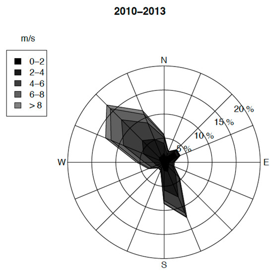 Distribution of the wind directions throughout the four years experiment. The wind rose indicates the occurrence of wind speeds for 16 wind directions.
