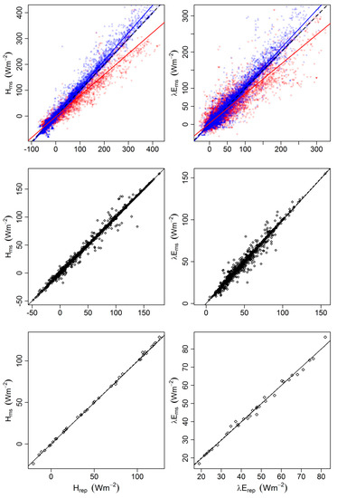 Further, the daily flux data were integrated at the monthly time scale. As expected, we did not observe any effect of the way the REddyProc procedure was applied (REP vs. RNS), for both H and λE. The dispersion around the regression line was low: 1.3 and 1.7 W·m−2 for H and λE, respectively.
