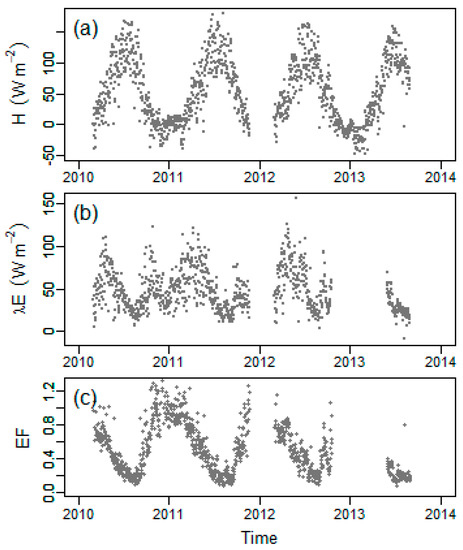 Seasonal evolution of the land surface fluxes at daily time scale. (a) Sensible heat flux (H); (b) Latent heat fluxes (λE); (c) Evaporative fraction. Both fluxes were gap-filled by REddyProc, without separating the wind directions (REP).