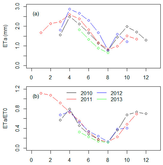 Seasonal evolution of the actual evapotranspiration at monthly time scale, during the four years of the experiment. (a) Actual evapotranspiration ETa; (b) Ratio of actual evapotranspiration to reference evapotranspiration ET0.