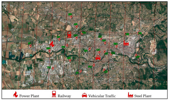 Map of monitoring sites of Terni with the particulate matter dispersion grid (Google Earth) and the main local emission sources represented.