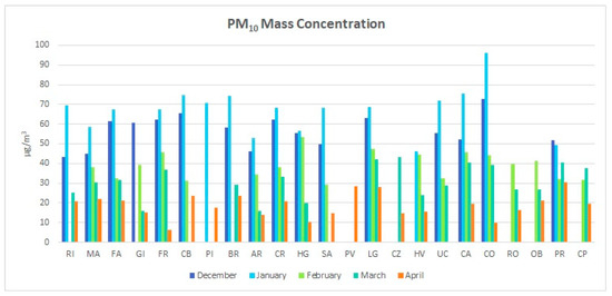 PM10 mass concentrations (μg/m3) recorded at the 23 collection sites during the 5-month monitoring campaign.
