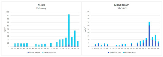 Soluble and residual fractions of Ni and Mo concentrations (ng/m3) recorded in February at the 23 collection sites.