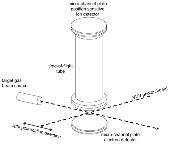 A tunable monochromatic synchrotron light beam, with a resolution af about 1.5 meV, crosses at right angles an effusive molecular beam of C2H2, and the product ions are then detected in coincidence with photoelectrons. The light polarization vector is parallel to the synchrotron ring plane and perpendicular to the time-of-flight direction of detected ions. Incident photon fluxes and the gas pressure are monitored, and the ion yield has been corrected for flux changes of pressure and photon, when the photon energy was scanned. The used PEPIPICO coincidence extraction and detection system (see Figure 1) is fully described in Ref. [28]. Such a device consists in a time of flight (TOF) spectrometer equipped with an ion position sensitive detector, being especially designed in order to properly measure the spatial momentum components of the dissociation ionic products [29]. The analysis of the recorded coincidences distribution (at each investigated photon energy) as a function of the arrival time differences (t2 − t1) of fragment ions to the ion position sensitive detector (see Figure 1), can provide, by using the procedure already applyied in several works [30,31,32], the following observables: (i) the kinetic energy distributions for each product ion, (ii) the life time of the intermediate molecular dications, and (iii) the angular distributions of final ions coming out from its Coulomb explosion.