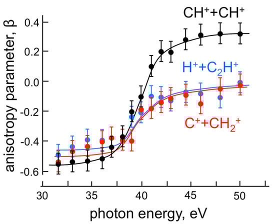 Photon energy dependence of the β anisotropy parameter (see Equation (4)) for each two-body fragment ion coming out from the Coulomb explosion of the C2H22+ molecular dication (see reactions 1–3), as measured at a 31.9–50.0 eV photon energy range.