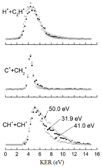 Such KER distributions as a function of the investigated photon energy are shown in Figure 3. In the case of reaction (3), the total kinetic energy distribution does not change significantly with the photon energy, conversely the reaction (1) exhibits a tail at higher energy, that can be fitted with two Gaussian curves. This is an indication that reaction (1) can occur with two different mechanisms [37,39]: a “slow” dissociation component in which the C2H22+ ion is mainly formed in its ground electronic state, with a lifetime of about 180 ns, and a “fast” dissociation component, above 37 eV, through the formation of a short lived dication in an excited electronic state, with a lifetime shorter than 50 ns. The same effect can be seen in the kinetic energy distribution of reaction (2), the symmetric one, but with a more spectacular pattern, where three components change with the photon energy, suggesting a much more complicated pattern involving several electronic states. This kind of ultrafast processes have been successfully studied, for example, in the case of the isomerisation of acetylene in vinylidene in X-ray FEL time-resolved experiments [40]. The same method could be applied in next future for the study of the dynamic of these ultrafast dissociation processes observed in the double photoionization of the acetylene molecule. Finally, it has to be noted that the translational energy content of each H+, C+, CH+ and CH2+ product ion is quite big, having an average value ranging between 4.0, 2.2, 2.5 and 2.0 eV, respectively. This kinetic energy is sufficient to allow this species participating in the atmospheric escape from Mars and Titan where they are characterized by a typical escape energy of 0.13 and 0.02 eV (in the case of H+), 1.5 and 0.28 eV (in the case of C+), 1.6 and 0.30 eV (for CH+), 1.8 and 0.32 eV (for CH2+), respectively [17,21].