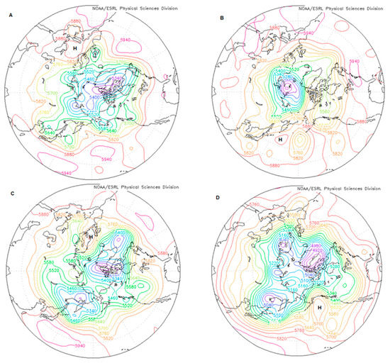 The 500 hPa height field for (A) 1200 UTC 24 June 2016 (weak Atlantic); (B) 1200 UTC 28 August 2016 (weak Pacific); (C) 1200 UTC 4 October 2016; and (D) 1200 UTC 24 February 2017. The center point at this time is labelled with an ‘H’.
