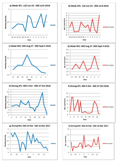 The (a,c,e,g) BI (no units) and (b,d,f,h) IRE (× 10−8 s−2) for the weak Atlantic, weak Pacific, strong Atlantic, and strong Pacific blocking events, respectively.