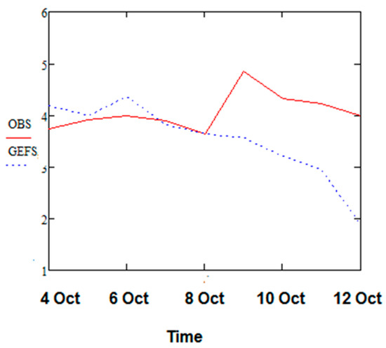 When examining the intensity of the GEFS blocking event and comparing these to the observed intensities, the GEFS model blocking events were weaker across all events, although the model forecast BI was improved as the initial forecast time approached the observed onset time. While it is not true that GEFS model block intensities were uniformly weaker across all time periods, the best comparison of model to observed BIs happened closest to onset (and the initialization period). An example of this behavior is shown in Figure 5. The GEFS model and observed blocking BI are similar for the first few days of the event, and for two of these days the model blocking was actually stronger. However, after 8 October 2016, the GEFS model BI decreased rapidly up to 12 October, while the observed events were relatively constant throughout the period.