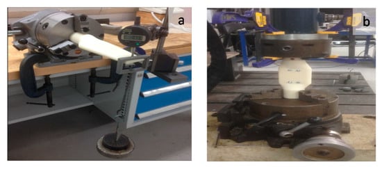 In this work, a number cantilever and tensile tests were carried out on the blade prototypes to determine their structural design integrity. The cantilevered beam deflection test, shown in Figure 2a, comprised the tapered aerofoil blade design clamped at one end horizontally and a force applied at the opposite end in a downwards direction. The test simulated the aerodynamic load applied to a wind turbine blade during service, as the blades root is fixed (replicating a hub attachment), and the load is applied at the end of the blade. Two loading cases were utilised for testing, with the blades loaded incrementally as well as cyclically, to closely replicate the changes in wind force caused by wind shear. The deflection was measured 10 mm from the end of the blade using a Mitutoyo 543–782 Absolute Digimatic Indicator in all of the cantilever tests. This testing approach was applied to a three-piece modular blade with and without tendons, and a single-piece hollow aerofoil blade to allow for comparison. The tensile extension test, shown in Figure 2b, comprised blade design with constant aerofoil section and large solid ends, clamping the blade at one end vertically and applying a force at the opposite end in a downwards direction.