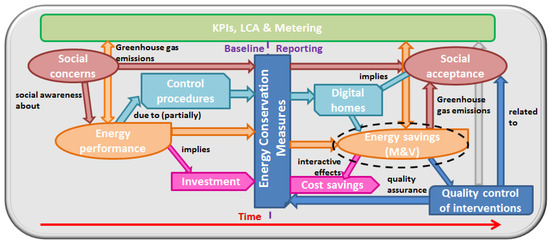 Starting from the left hand side, it is shown that the energy concerns begin with social awareness, both at citizens’ level and at organizational level (public authorities, sustainability plans, etc.). The low performance due to existing facilities or wrong control strategies has as a consequence emissions of greenhouse gas (GHG), and the improvement of such performance and the inclusion of new technologies implies an initial investment. Collecting all these aspects through metering determines the retrofitting strategy as well as the best ECM for the specific building or district.