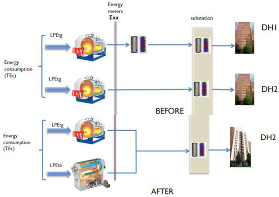Figure 2 represents the situation before (left) and after (right). The initial status contained two district heating based on two gas boilers, while new situation is one single district heating based on one biomass boiler and a second (gas) boiler for support. Bearing this in mind, some indicators are required to evaluate the energy savings. The main one is the primary energy consumption (TEC in