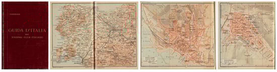 The editorial project foresaw seven guides, the first six of which were dedicated to Italy and the seventh to Italian colonies, each with about 300 “very dense” pages plus another hundred pages of “topographical maps, city maps, panoramas, particulars for building interiors, museums, and the like” for a run of 150,000 samples [] (p. 579). In 1914, therefore, the first “Guida Rossa” (Red Guide), Piemonte, Lombardia, Canton Ticino was printed, with about 600 pages of text, one orientation map, 28 special maps, 9 maps of tourist centres, 18 city maps, and some museum interiors and collections. This new editorial adventure was rather more vast than what was imagined, even just for the number of volumes, pages, and copies, and it would contribute significantly to the business of spreading culture, especially tourist/geographical culture, favoured by its free distribution to members (Figure 1).